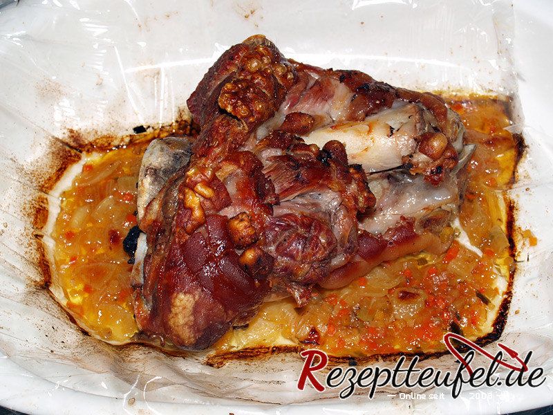 - Die gegarte Schweinshaxe im aufgeschnittenen Bratschlauch