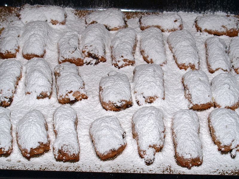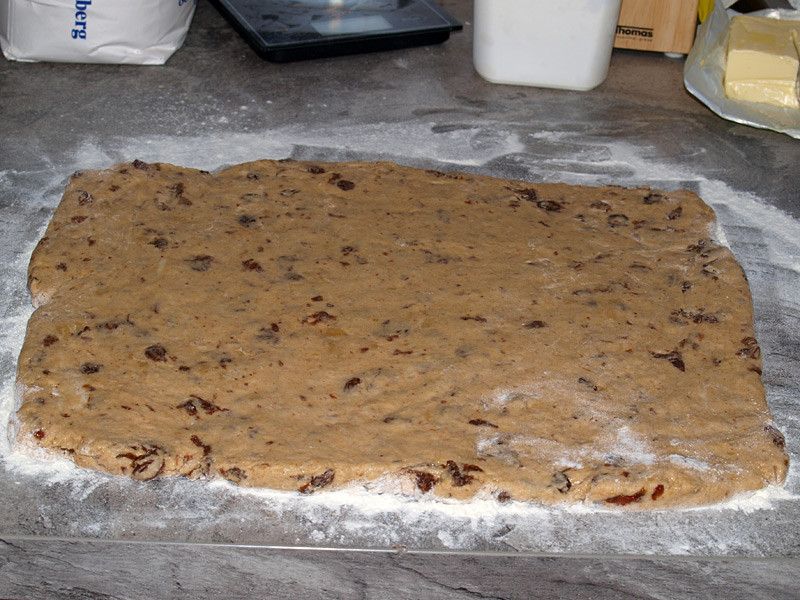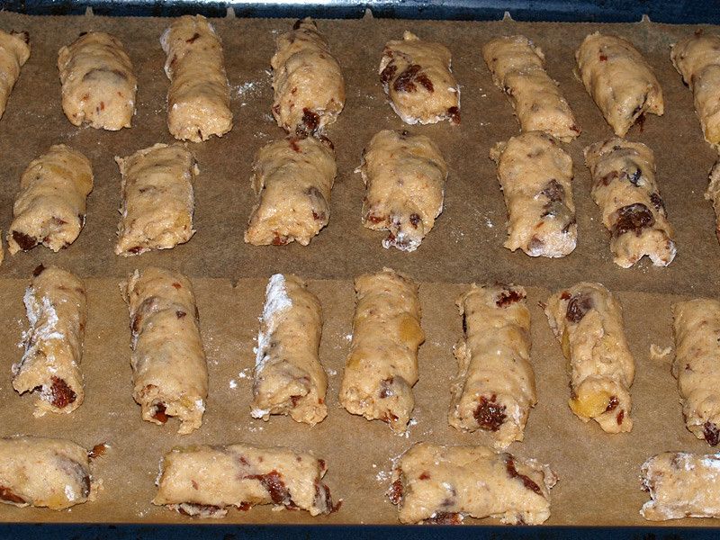 - Den weichen Teig auf einer gut bemehlten Arbeitsfläche zu einem Rechteck von ca. 2 cm Dicke ausrollen und in Stücke von ca. 5 x 3 cm schneiden (geht hervorragend mit einer Teigkarte).Die Stollenstücke mit 2 cm Abstand auf zwei mit Backpapier belegte Bleche setzen.