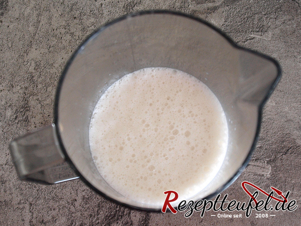 - Den Zucker in die Milch geben, die Hefe einrühren und zugedeckt an einem warmen Ort ca. 20 Minuten gehen lassen bis sich Schaum auf der Hefemilch gebildet hat.