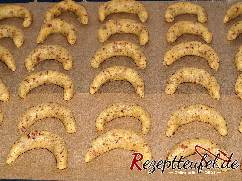 - Den Teig aus der Kühlung nehmen und ca. 5 cm dicke Rollen daraus formen. Diese nochmals kurz kühlen. Nun die Rollen in ca. 1/2 cm dicke Scheiben schneiden (oder mit dem Teigschaber abtrennen) und aus jeder Scheibe eine spitz zulaufende ca. 5 cm lange Stränge formen. Die einzelnen Stränge zu einem Hörnchen formen.Die Hörnchen auf ein mit Backpapier ausgelegtes Backblech legen.