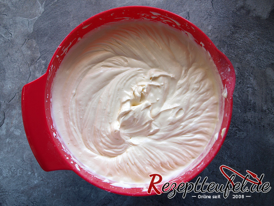 Den Quark, das Puddingpulver, das Salz und den Schmand hinzufügen und solange verrühren bis eine glatte Masse entstanden ist.