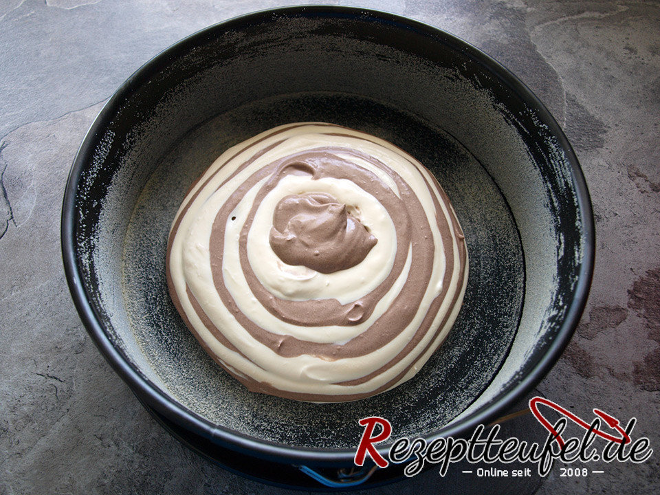 Eine Springform von 26 cm Durchmesser ausfetten und mit Grieß ausstreuen. - Zwei Löffel vom hellen Teig in die Mitte der Form geben, darauf zwei Löffel vom dunklen Teig. So weiter verfahren bis der gesamte Teig verbraucht ist.