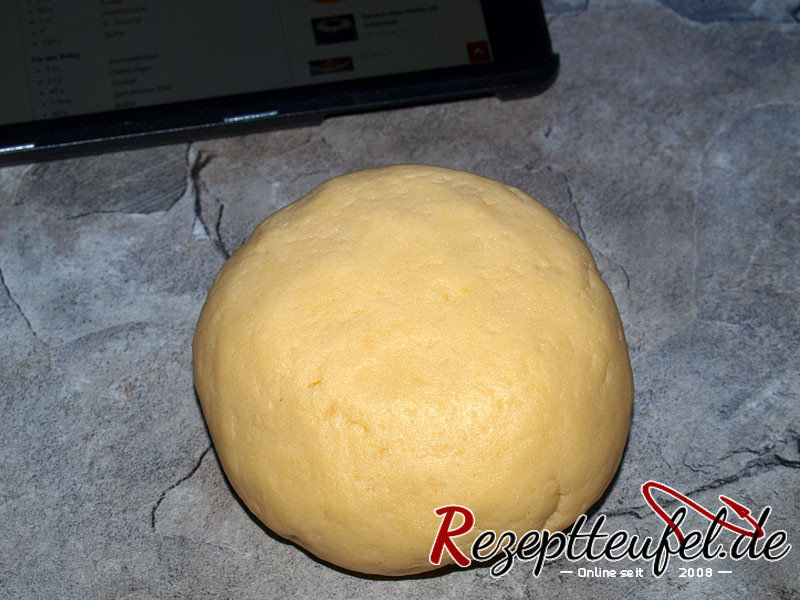 - Für den Teig das Mehl mit dem Backpulver vermengen und in eine Schüssel geben. Den Zucker, Vanille-Zucker und eine Prise Salz darauf verteilen. Eine Mulde in den Schüsselinhalt drücken und das Ei in die Mulde geben. Die Butter in kleinen Stücken auf dem Rand verteilen und alles schnell zu einem glatten Teig verkneten. Den Teig in Folie wickeln und für ca. 30 Minuten in den Kühlschrank legen.